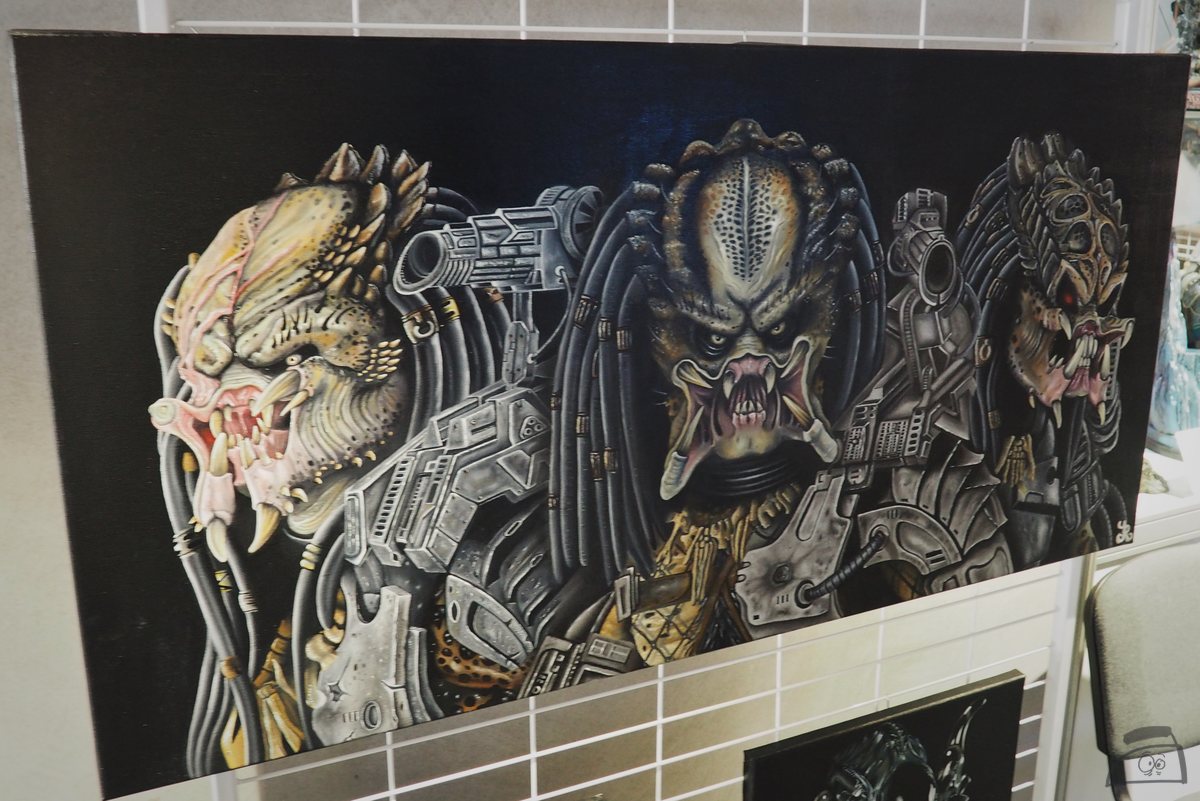 Na hlavní stagi jsou téměř neustále přítomni nějací herci, ale nemůžeme jen sedět na místě. Naštěstí mají někteří herci více než jeden panel, a tak si necháváme něco i na neděli a jdeme nakupovat. Petr pustil kačku Nikoušovi a Danu Černému za nějaké originály a já jakožto milovník hororu a majitel trhače-pomeraniana jsem nemohl odolat malbě fenkodlaka od Murina Wolfa.