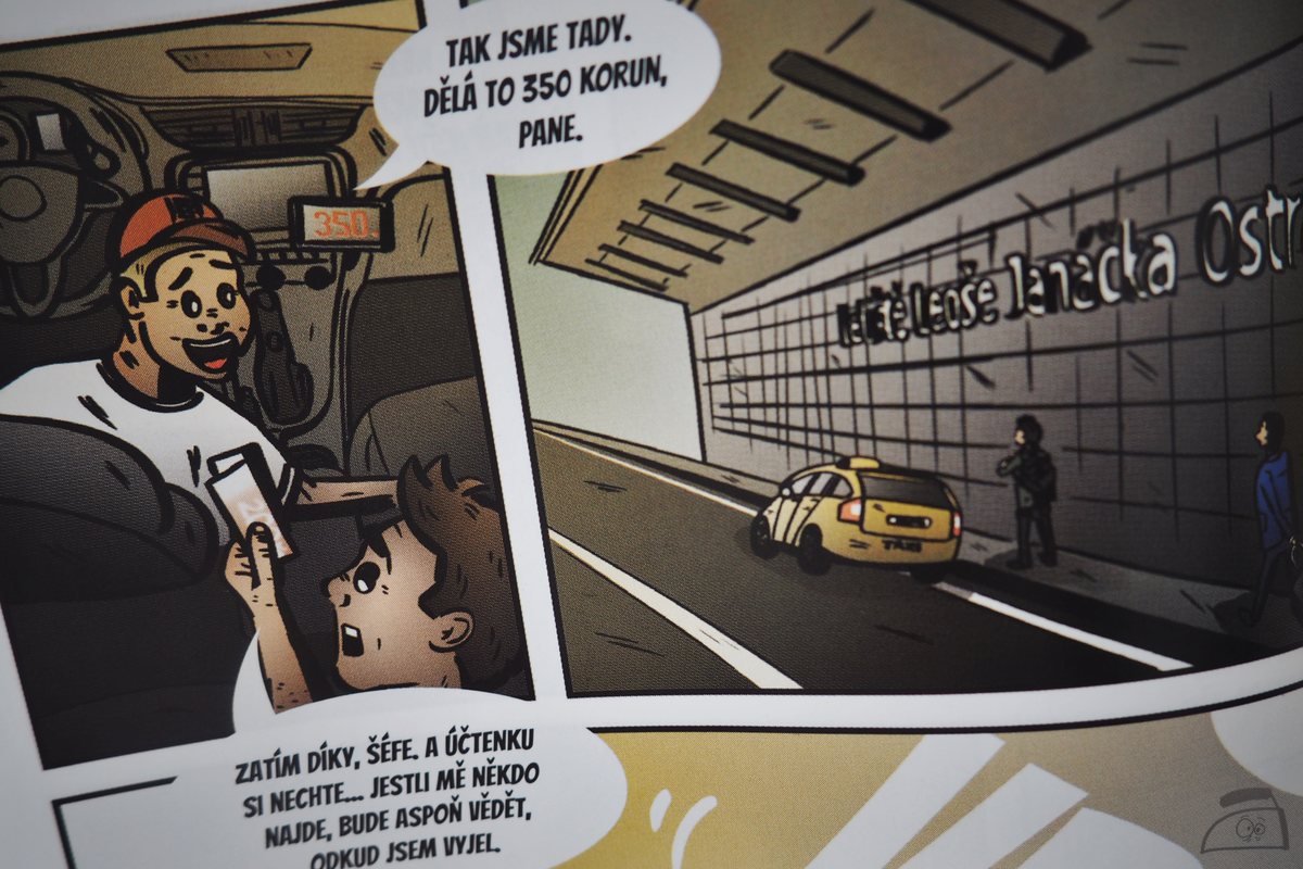 To se vám tak přestane ozývat manžel ze závodu z Amsterdamu k Bajkalu ve starém vraku. Co by se tam tak mohlo podělat, že? Manželka si začne po několika dnech dělat starost, a tak ji nenapadne nic lepšího, než požádat o pomoc společného kamaráda Oskara, který si plácá sochy z hlíny a ani snad ještě nevytáhl paty z Moravskoslezské metropole. Autor Marek Jurnost je ajťák z Ostravy, stejně jako já. Svou domovinu promítl do komiksu hned ze startu. Když vidím ostravské dominanty, letiště Leoše Janáčka a modrou DPO tramvaj, tak mé černouhelné srdce zaplesá. Radost vystřídají vykulené oči, mé oči, jelikož oním ztraceným manželem a kamarádem je Filip Horák. Kontroluji svou existenci a pulz a vše se zdá být v normě, takže naštěstí asi jen shoda jmen. V Ankaře jsem taky nebyl a ta částka taky nesouhlasí. Filipa z našeho příběhu neposledy viděli právě v Ankaře, a tak sochař neváhá, kupuje letenky a roadtrip začíná.