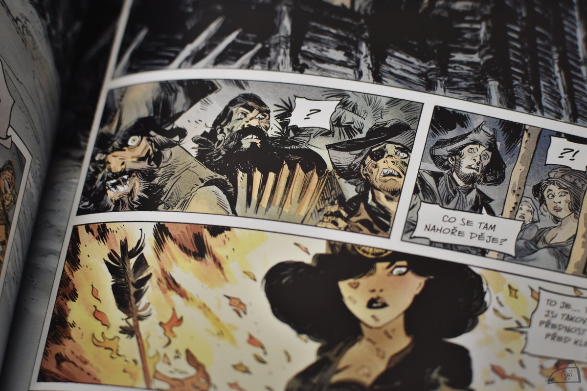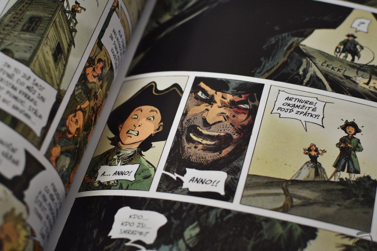 Ženy jsou celkově pro Revena jakýmsi prokletím, protože v polovině knihy, na konci prvního příběhu zachraňuje mladou Annu ze spárů pirátky Darksee a riskuje tak svůj život nejen pro nalezení pokladu. A já se už během prvních stánek pozastavuju nad jednou věcí. Proč se nedočkáme nějakého pořádného komiksu, který nám ukáže těžký život karibských pirátů a jejich obětí bez příkras. Nemyslím tím bizarní krvavo-erotickou podívanou ve stylu Jodorowského, ale zkrátka trochu méně romantizovaný vhled do tohohle už dávno zapomenutého světa. Vyprávění o mapě vedoucí k prokletému pokladu, který je označen X pod obrázkem běsnící sopky, to je na druhou stranu něco, co k tradičním povídačkám o pirátech patří, a tady toho máte pořádnou porci.