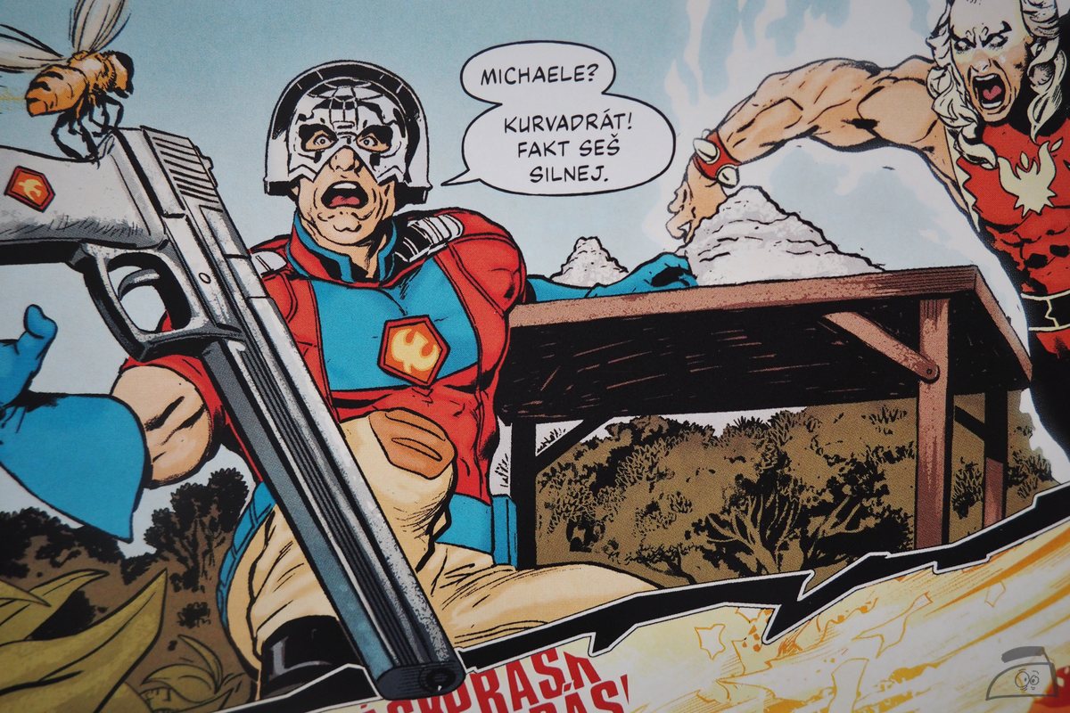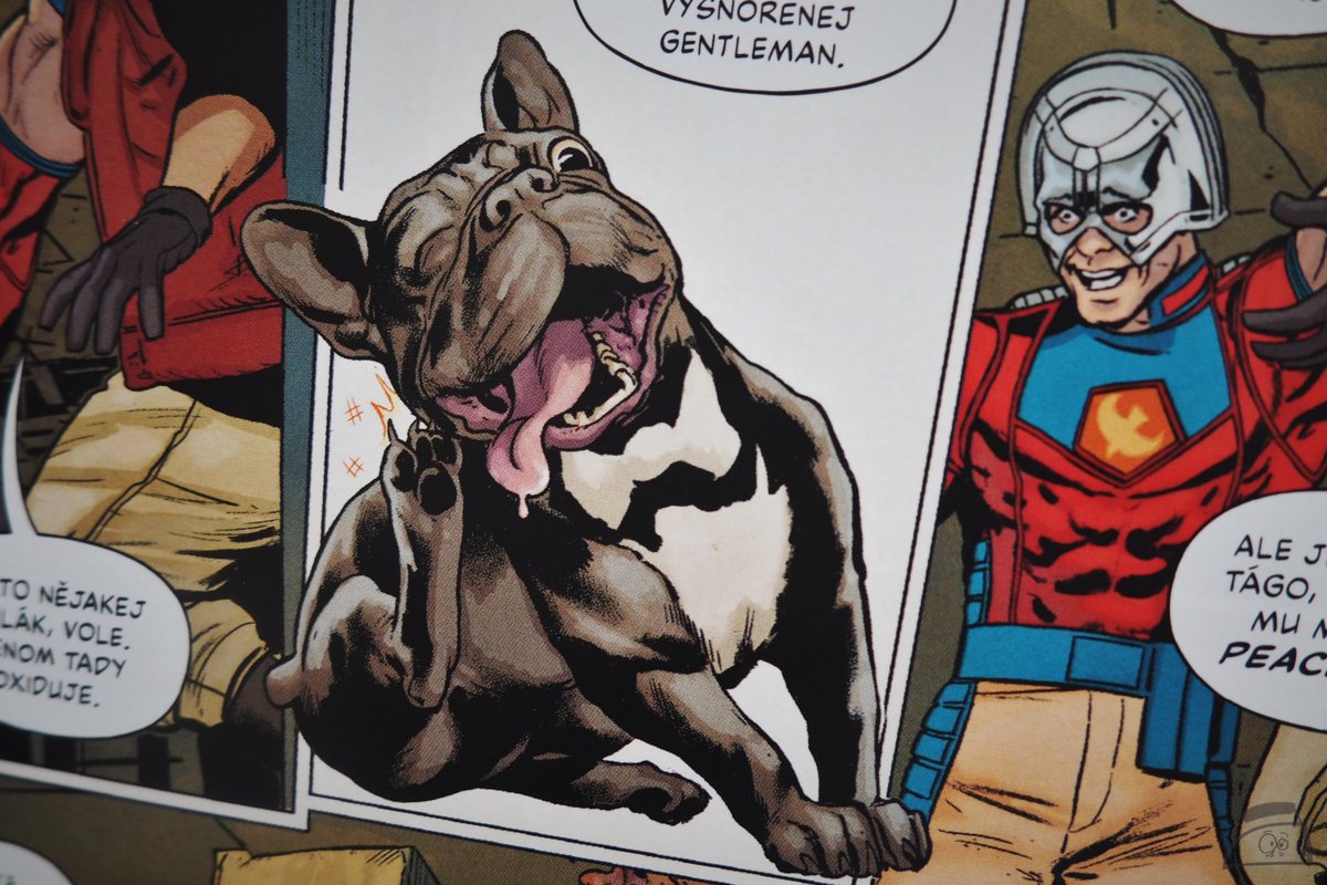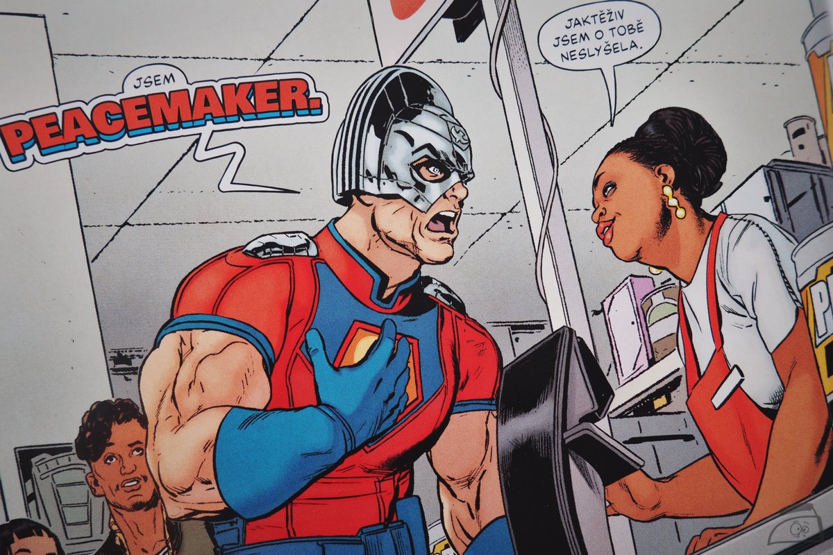 Peacemaker se fakt snaží! Slibuje to už název a od prvních stran to nabývá na realitě. Kupující si protein a okusující jerky mi připomíná mě sama, pak ještě možná tím, že jej ani prodavačka nezná, ale tím veškerá naše podobnost končí. Jeho postava se v komiksu až podezřele podobá již zmiňovanému wrestlingovému zápasníkovi. Většinou mi vadí, když se kreslená varianta podobá herci, ale tady to není zase tak do očí bijící. Peacemaker by pro mír udělal všechno, i snědl kýbl výkalů, jak sám poznamenal, a proto vezme zakázku od staré šéfové Amandy, byť už on sám není součástí Sebevražedného oddílu. Ten mimochodem odmítne pozvání na jeho párty, protože jim minule ukazoval sbírku péčka. Tak přece jenom mám s ním více společného. No nic, pouštím si písničku Mad World a pokračuji ponuře ve čtení. Melancholie ale netrvá dlouho, neboť téměř na každé stránce je něco vtipného. Vyřídit tyhle teroristy bylo pro něj téměř nudné, ale našel zde francouzského buldočka a ihned si jej zamiloval. Aspoň někdo si jej všímá, a tak ho adoptoval. Jako terapeut funguje tomuto prostoduchému mírotvůrci dokonale, ale jen do doby, než mu ho unesou. Tím defakto začíná hlavní příběh.