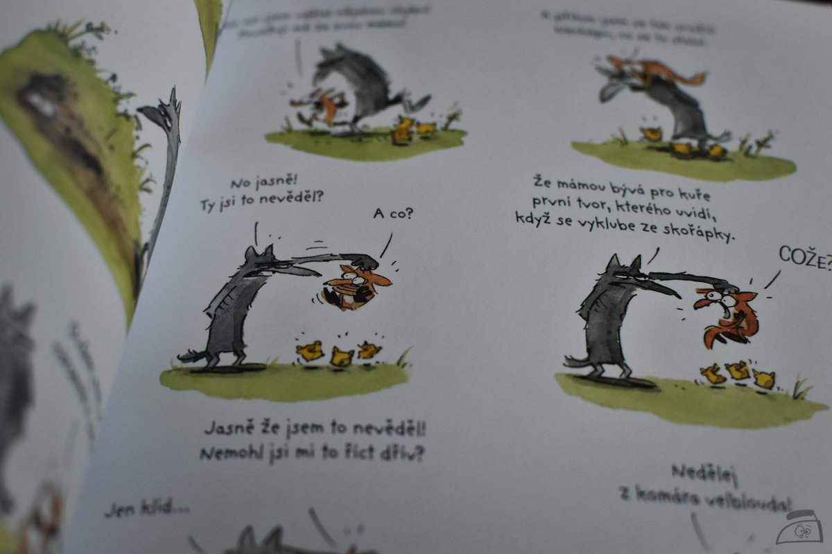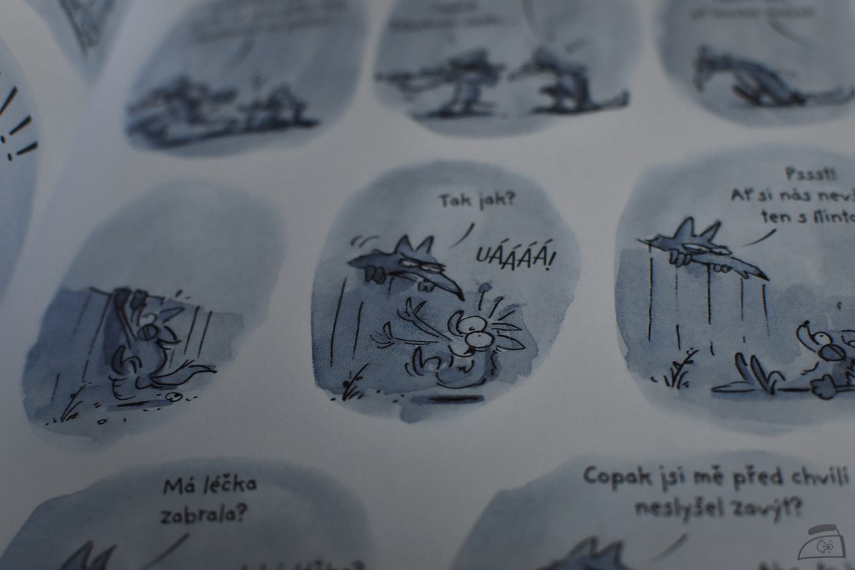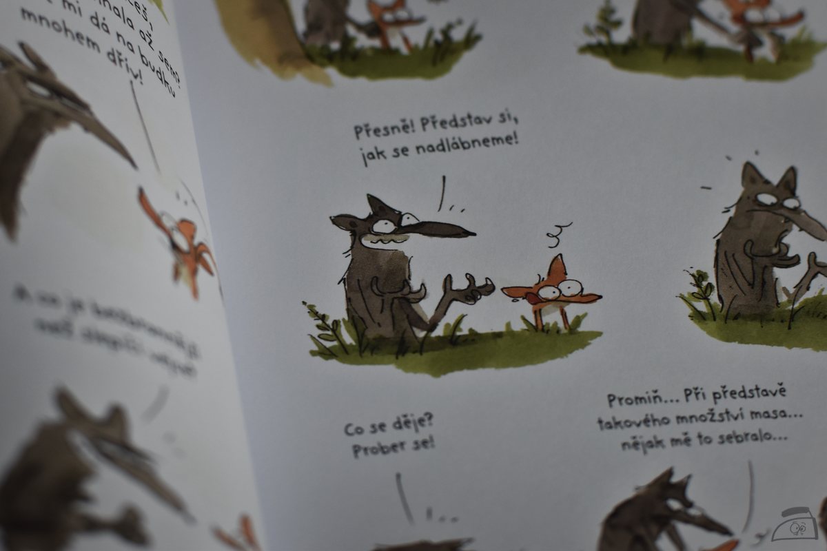 Hlídací pes sice nepředstavuje nijak výrazné nebezpečí, ale slepice se nedají a klidně by chudákovi lištičce vyklovaly oči a ještě si šly stěžovat. Ukrást vejce tedy bude oříšek, ale vlk ví, jak správně tahat za nitky, aby lišák dělal přesně to, co nakonec přinese zisk jen jednomu z nich. Jak už jsem psal, Lišák není až tak zlý, ale spíše trošku naivní. Při čtení jsem mu fandil, a to i díky laskavému humoru, kterým je celý tenhle komiks protkaný. Nejvíc mi to připomínalo jakýsi mix Malého Mikuláše a Charlieho Browna. I když se jedná o kratší skeče, dohromady jsou propojeny v jeden poměrně ucelený příběh lišáka, který snil o své první zakousnuté slepici.